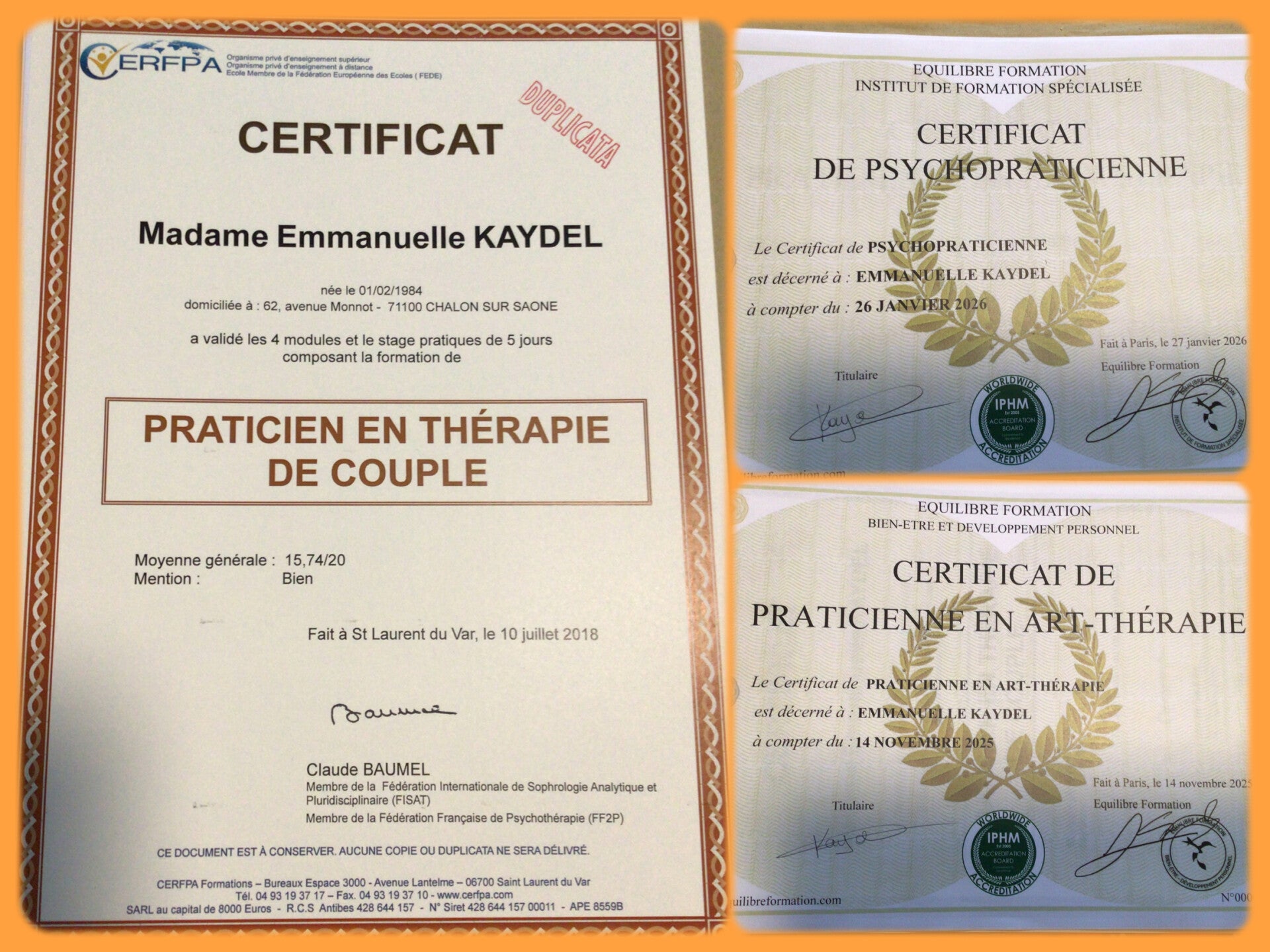 Après l'obtention d'un certificat de praticienne en thérapie conjugale, j'ai d'abord été conférencière sur des thèmes en lien avec la relation de couple, en France et à l'étranger. Puis, j'ai diversifié mon approche en obtenant un certificat de praticienne en sexothérapie. J'ai voulu également élargir mon aide à toute personne et j'ai étudié la pratique de la psychothérapie, pour laquelle je suis également certifiée. En parallèle, j'ai étudié pour obtenir mon certificat d'art-thérapeute afin d'allier les arts à la pratique thérapeutique.